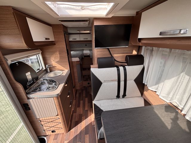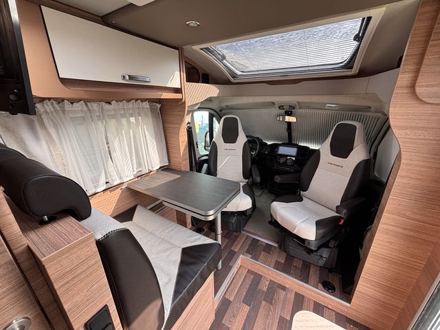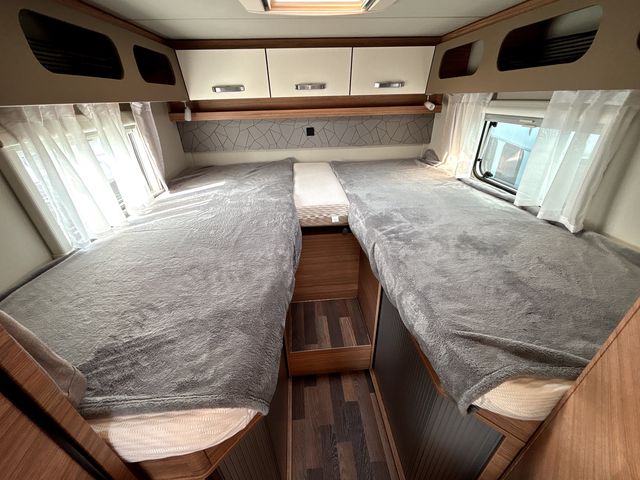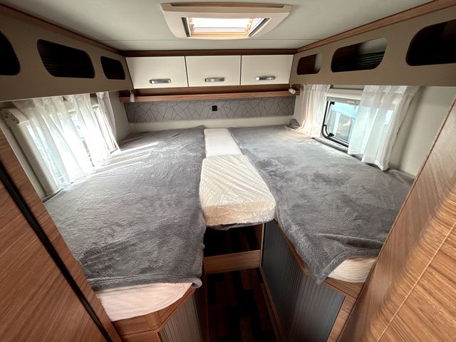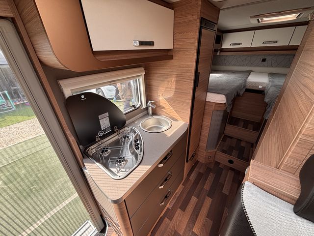 Gyönyörű, újszerű lakóautó, melynek hálófülkéje használható 2 heverőként, vagy kialakítható belőle egy franciaágy! Komplett konyhával: mosogató, gáztűzhely, torony hűtőszekrény. Zuhanyfülkével, beépített kazettás wc-vel és beépített víztartállyal! A fűtést és a meleg vizet combi kazán biztosítja, a nyári hűvösről pedig tetőklíma gondoskodik! Forgatható utasülésekkel 4 fő részére kényelmes étkező alakítható ki! Az ablakokon és a panoráma tetőablakokon kombirolókkal, az ajtón szúnyoghálóval, az utasfülke ablakain pedig sötétítőrolókkal felszerelve! A kétkerekűek kényelmesen szállíthatóak a nagy méretű garázsban található kerékpártartón! A kényelmes ki és bepakolásról szervízajtó gondoskodik. Előtetővel és fellépő lépcsővel felszerelve! Az utasfülke kényelmét manuális klíma,központi fejegység (AM/FM rádió, GPS navigációs rendszer, tolatókamera) multifunkciós kormánykerék, USB aljzat, kartámaszok és tempomat biztosítja. Könnyűfémfelnikkel. A lakóautót teljesen útra készen adjuk át! Az ár tartalmazza a névre írás költségét is!
