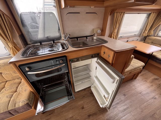 Világos tágas lakókocsi két ülőgarnitúrával, melyek ággyá alakíthatóak, valamint egy lehajtható emeletesággyal, így 5 fő részére nyújt kényelmes fekhelyet! Komplett angol konyhával: hűtőszekrény, mosogató, gáztűzhely, gázsütő! Zuhanyfülkével, beépített kazettás wc-vel és melegvízrendszerrel! Az ablakokon és a panoráma tetőablakon kombirolókkal, az ajtón szúnyoghálóval felszerelve! Gázfűtéssel, valamint ultraheat elektromos fűtéssel, így egész évben komfortosan használható!